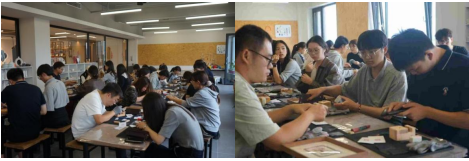 随后,师生前往易水非遗体验馆。资深非遗讲解员结合实物展示与现场技艺演示,详细讲解了易水砚制作技艺、砚拓等非物质文化遗产的历史渊源与当代传承情况,并生动讲述了非遗传承人的匠心故事,使同学们深受触动。在非遗传承人指导下,师生先学砚拓,反复调整墨汁浓度,掌握技巧后装框拓片;再进行篆刻,用安全刻刀在坯料上进行创作,修正偏差后钤盖印章,深化了师生对传统工艺精神的理解。易水非遗体验馆馆长结合自身经验,分享了技艺心得,并介绍了非遗在文创产品、现代设计等领域的创新应用案例,为同学们拓宽了文化传承与创新结合的视野。