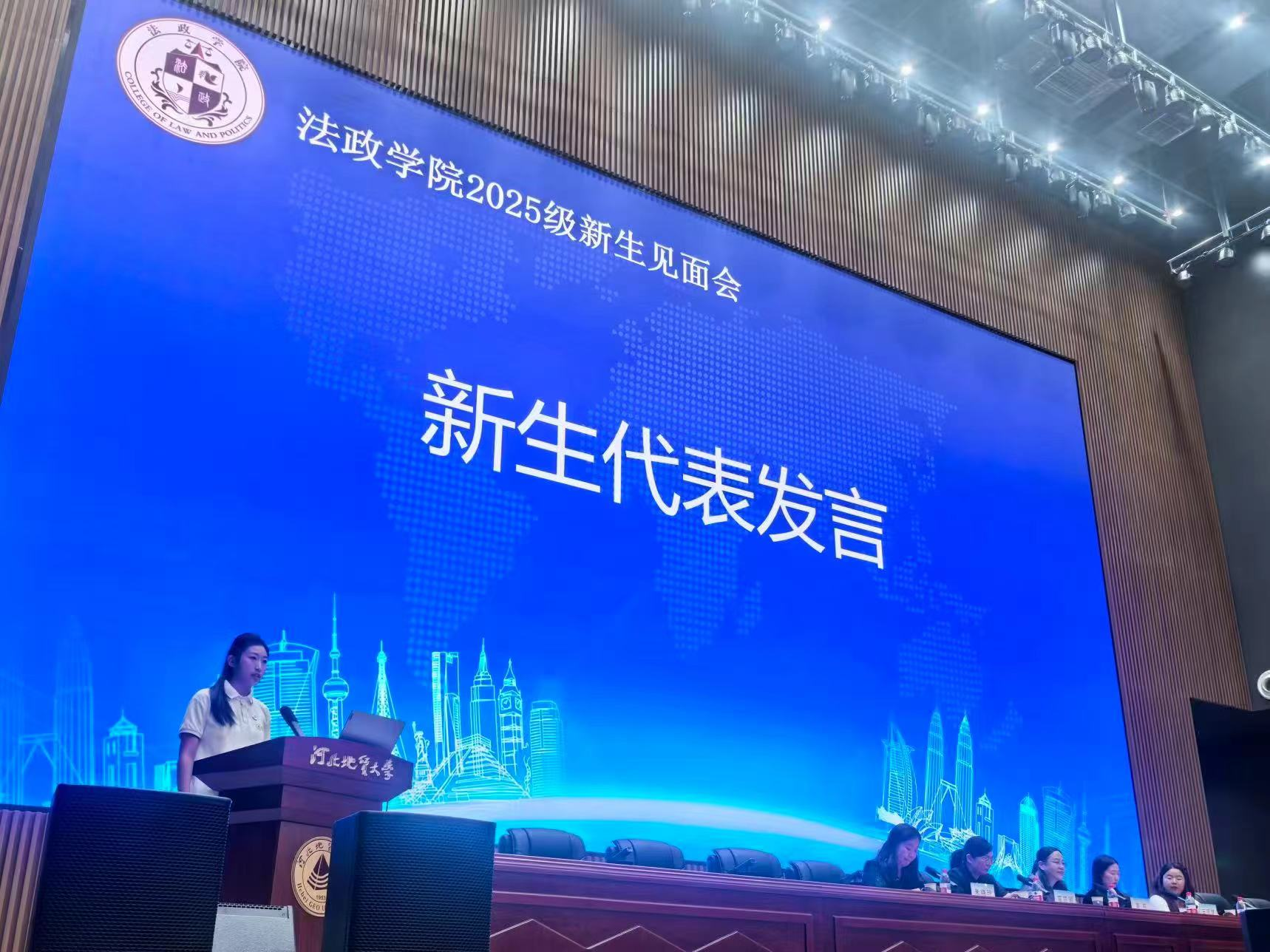 新生代表任思诺同学以“在理想与现实的交汇处,让我们共同定义未来”为主题发言。她代表全体新生郑重承诺,将珍惜大学时光,于图书馆中研读经典,在课堂内外激扬思想,以“法政人”之身份自觉担当,以青春之笔书写公正,以智慧之光烛照未来,共同致力于构建更加美好的社会图景。