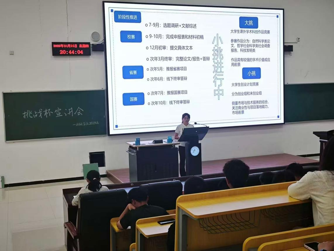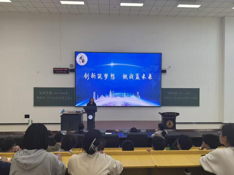 学院于2025年10月14日召开2025-2026年“挑战杯”竞赛宣讲会。学院党委副书记朱晓玲及全体辅导员老师参加会议,各年级学生齐聚一堂,共赴创新征程。朱晓玲副书记深刻阐释“挑战杯”作为高校科技创新品牌赛事的育人价值,希望法政学子“敢闯敢试、善思善为”,挖掘学科交叉创新点,以优质项目彰显时代担当。随后,深耕“挑战杯”指导工作多年、经验颇丰的石金利老师开展专题分享。石老师从竞赛规则解读、选题策略研判、材料撰写技巧、答辩环节把控四个维度提出精准指导。23级民商法研究生商庭瑚,作为第十四届“挑战杯”创业计划竞赛省级三等奖选手,从项目初期的选题困惑、中期的团队协作难题、后期的打磨优化过程切入,生动讲述自身备赛故事,传递“坚持深耕、细节致胜”的备赛理念。