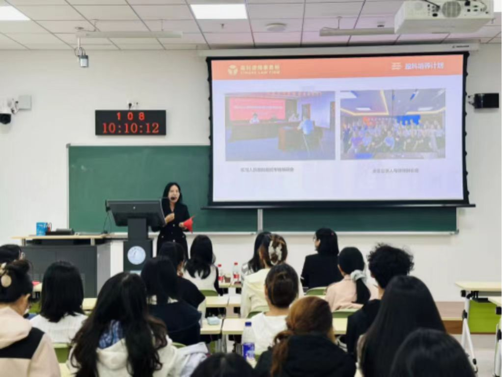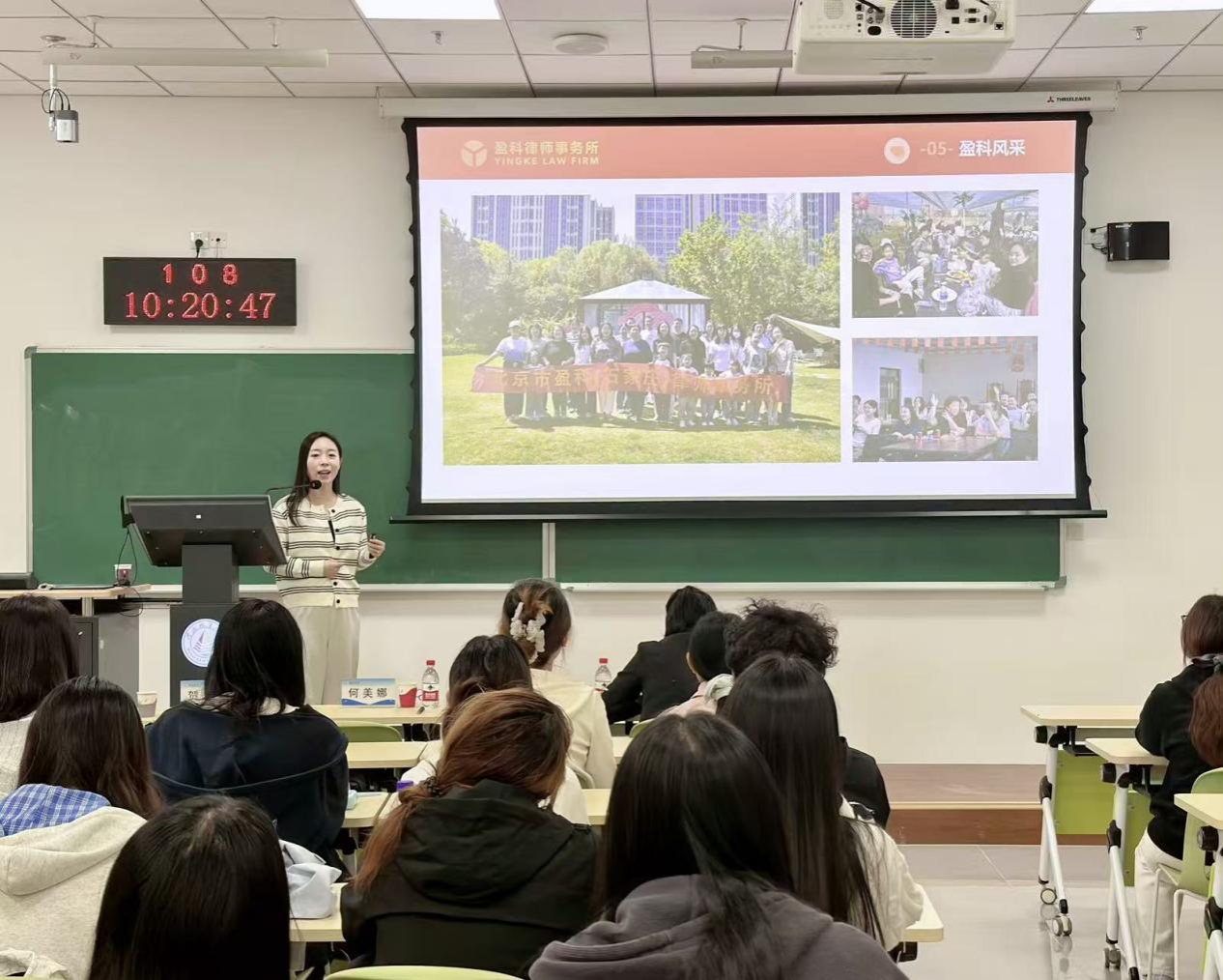 讲座开始,永利3044noc理论法教研室贺季敏老师对盈科律所一行人员表示热烈欢迎,并介绍了学院人才培养的特色和成效。随后袁梦雅向同学们系统介绍了盈科律师事务所的发展历程、业务领域、人才培养体系与晋升路径。从全国布局的办公网络,到多元化的法律业务生态,再到为青年律师打造的成长计划,全方位展现了律所的平台优势与发展潜力。现场,律师团队真诚发出邀约,欢迎永利3044noc优秀学子未来通过实习、校招等渠道加入盈科,与律所共同成长,在法治实践中实现职业价值。