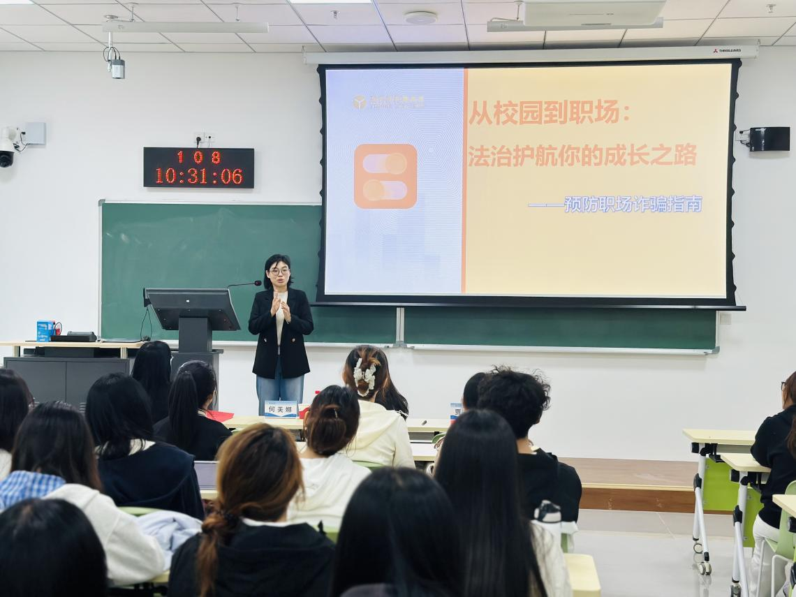 随后,贾克然围绕“法律职业技巧”展开讲解,结合自身执业经历,从法律文书撰写的逻辑架构、案件分析的核心要点、客户沟通的高效策略等方面,拆解法律实务中的关键能力,让同学们直观理解“理论如何落地实践”,有效填补了课堂学习与职业应用间的空白。针对“预防职业诈骗”这一关键话题,贾克然结合近年典型诈骗案例,揭露了“虚假实习岗位”、“伪造律所录用通知”、“代理合同陷阱”等职业风险,详细讲解了诈骗分子的话术套路与伪装手段,同时,她给出四方面防骗实用技巧:“核实信息”、“谨慎签约”、“保护隐私”、“及时报警”切实帮助同学们筑牢职业安全防线。